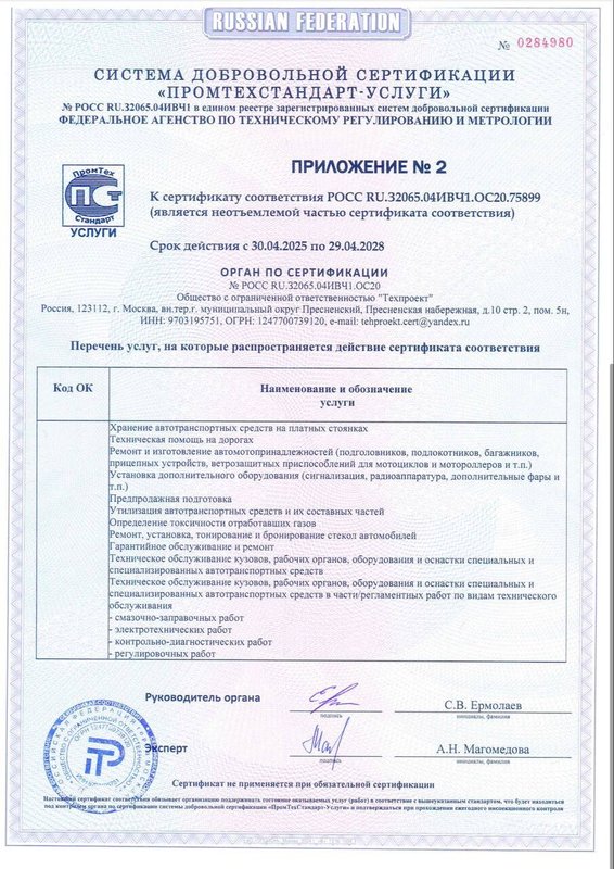Организация располагает коллективом профессиональных автотехников: у нас выполняют полировку кузова, ремонт автостекол, АКПП, электрооборудования и электронных систем управления автомобиля, установку автозвука и ксенона, шумоизоляцию салона. На услуги мастерской предоставляется гарантия, срок которой может варьироваться в зависимости от типа работ и используемых материалов.